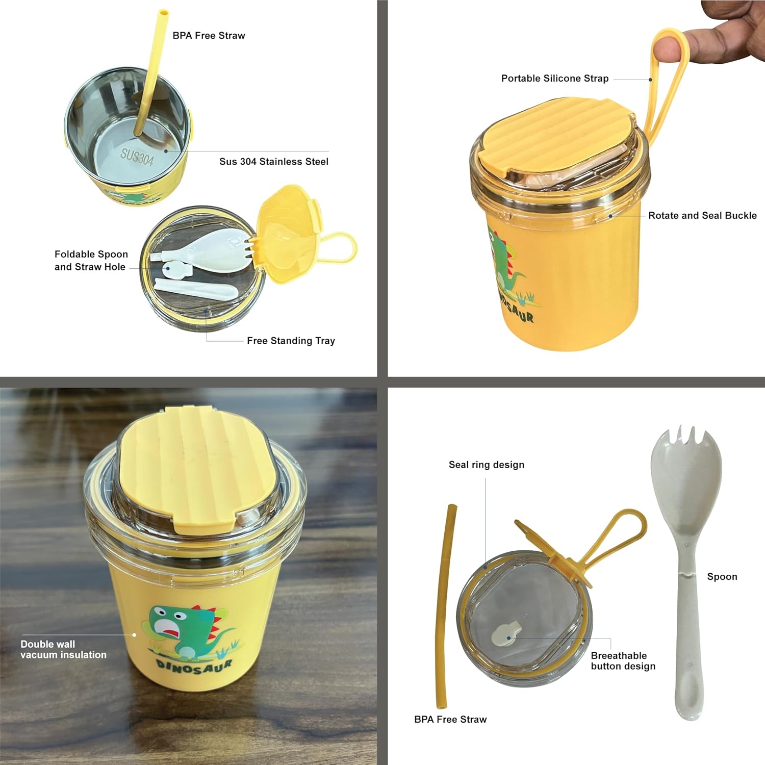Keep your meals and drinks at the perfect temperature for hours with our adorable dinosaur-themed insulated food container. This versatile 2-in-1 stainless steel vacuum cup comes with a built-in spoon and convenient sipper, making it ideal for both hot and cold foods. Perfect for kids and adults alike, this leak-proof and BPA-free container is great for school, work, or outdoor adventures. The durable blue design adds a fun touch to your daily routine while keeping your food fresh and ready to enjoy. Upgrade your mealtime experience with this stylish and practical insulated food container today!
